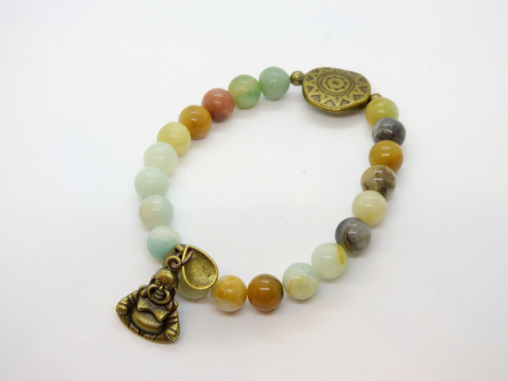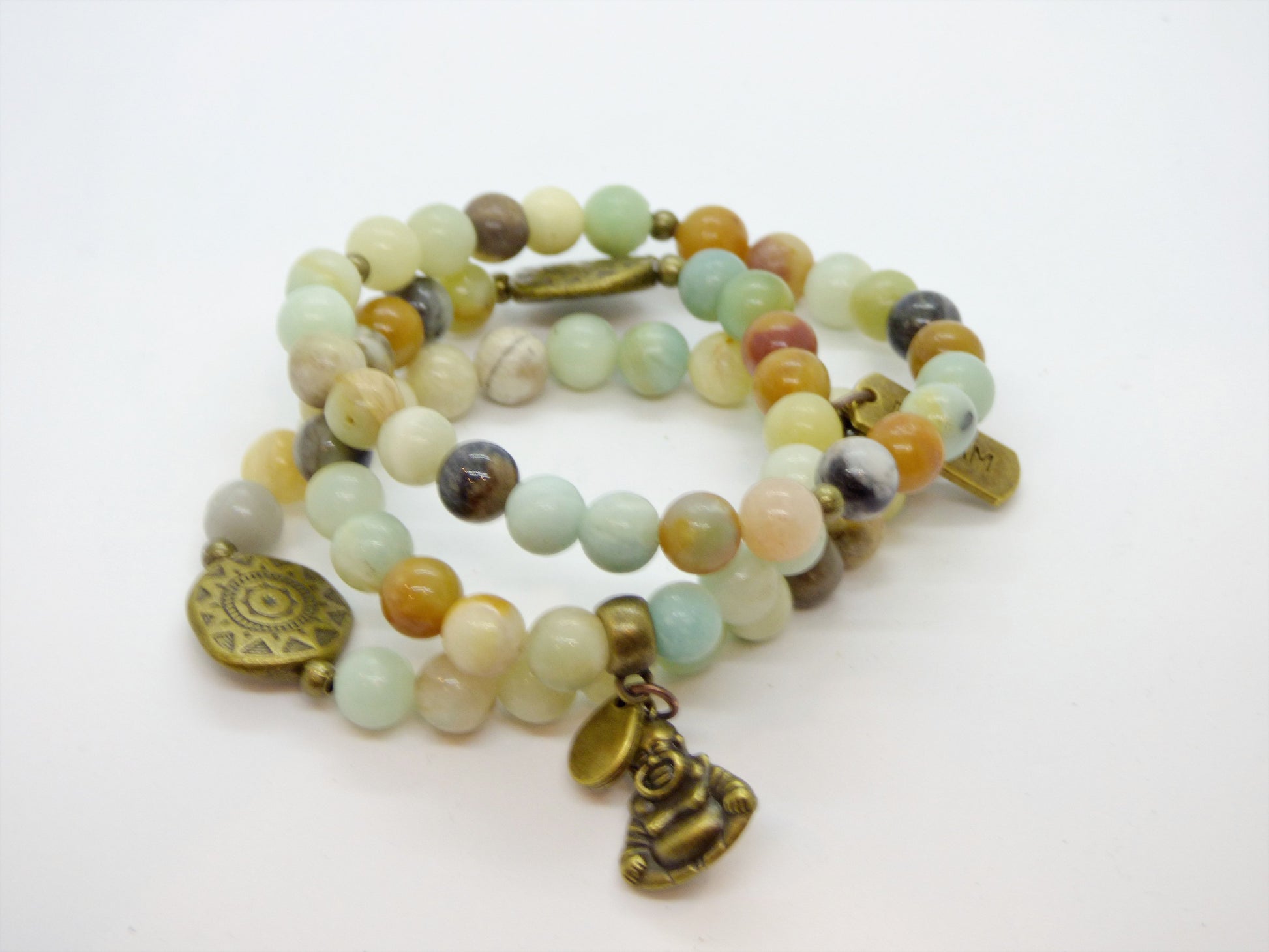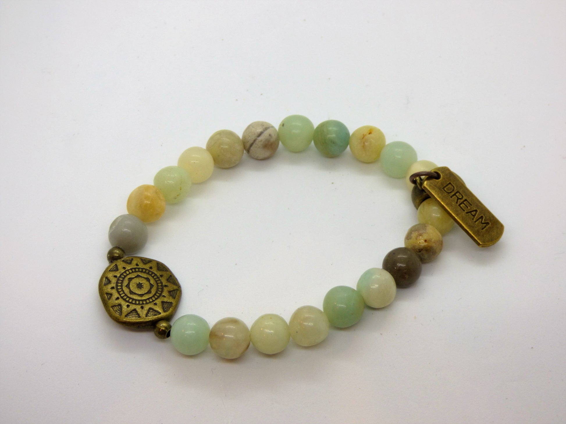 This out-of-the-ordinary Amazonite and Jasper bracelet, with a mix of Amazonite and Jasper stones twisted around a brass "live your dream" charm, will chill out your soul and keep you grounded. Stay calm, stay present - and stylish!