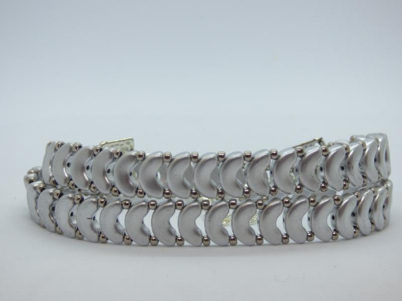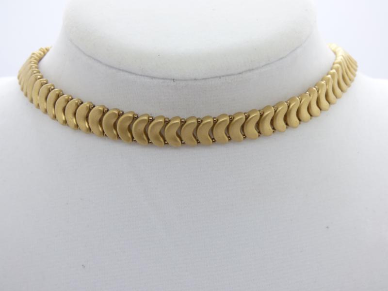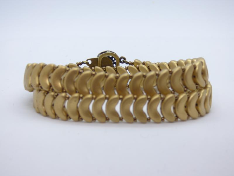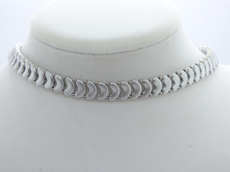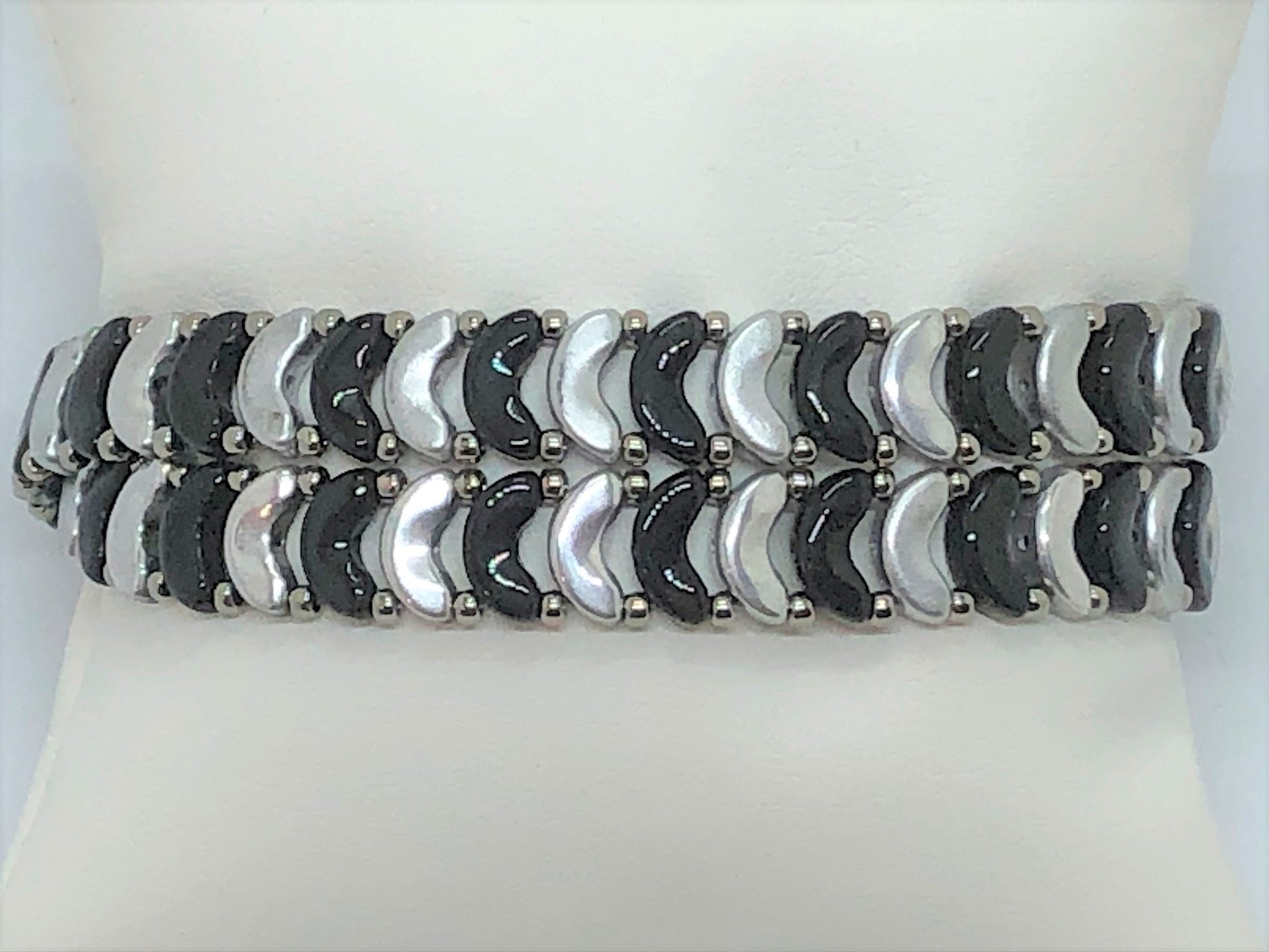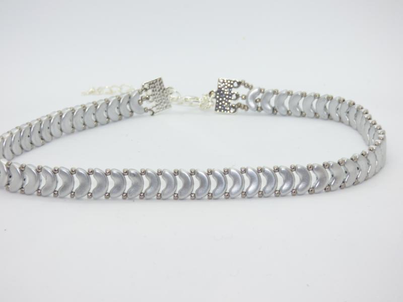 This amazingly different wrap can be worn either as a choker or wrapped twice around the wrist. These unique crescent shaped glass beads are hand sewn together (that's right -- with a needle and thread!) to form the perfect 14 inch wrap. It comes with a 2 inch extender that will dangle perfectly as a wrap or fit everyone as a choker. It comes in matte silver or bronze.