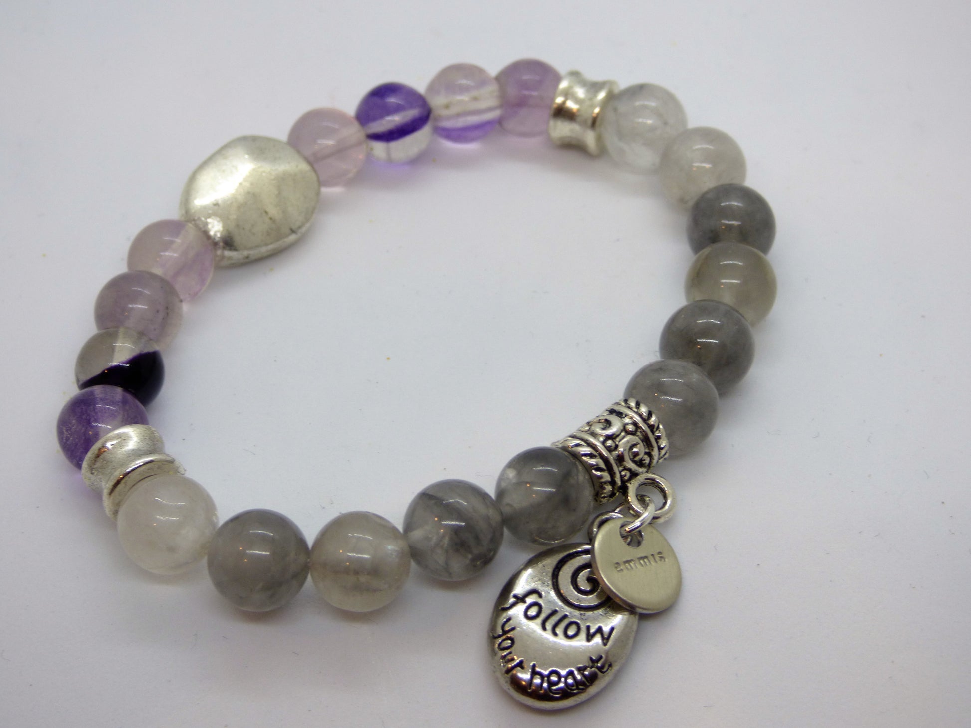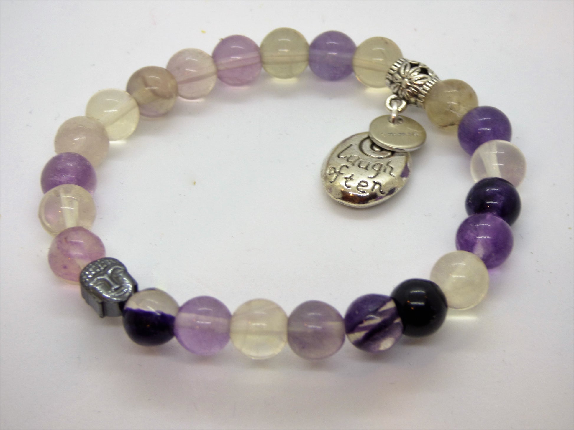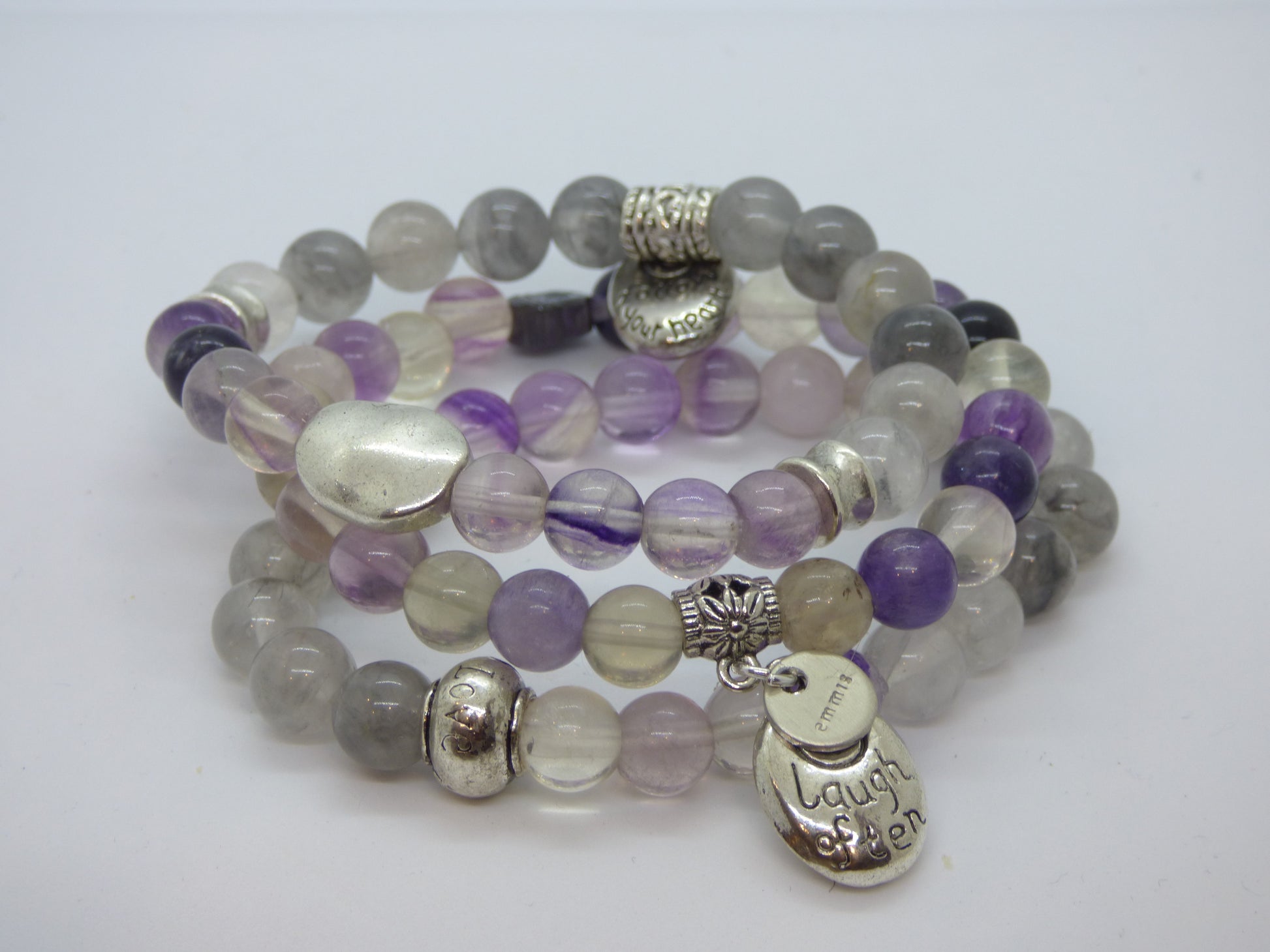 These 3 bracelets are unique and powerful. The fluorite will help to clean and stabilize your aura, allowing you to make a clear, thoughtful decision. While the Cloud Quartz will stimulate your crown chakra - allowing you to make a clear decision. While the stone may be cloudy, your mind will be clear!