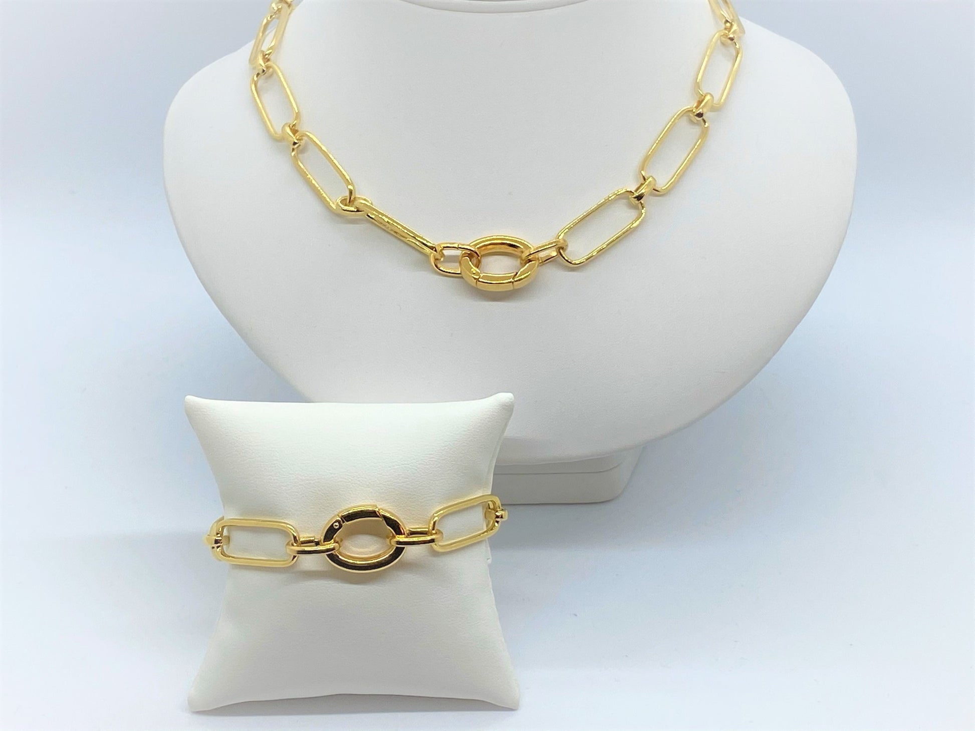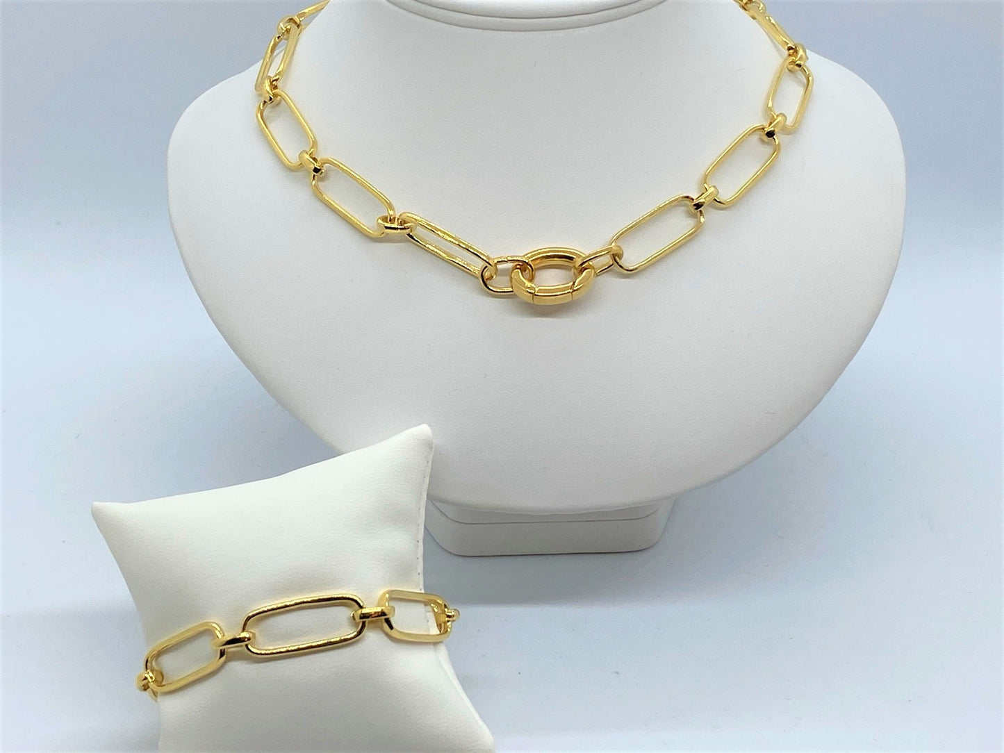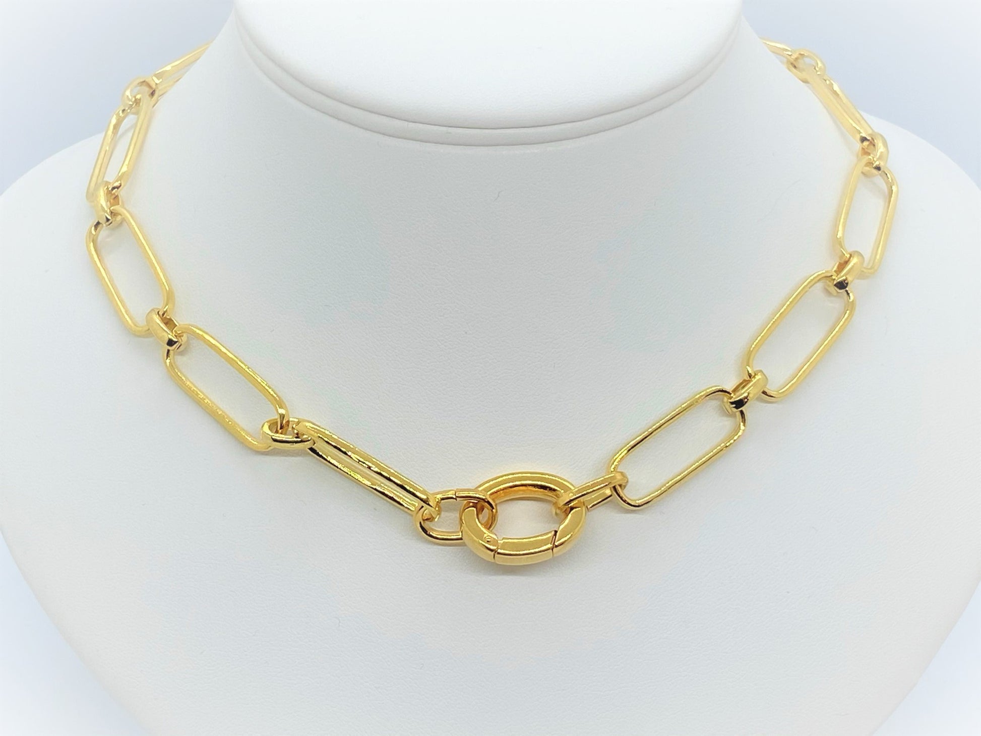This statement piece makes a fashion statement with its paper clip chain, the largest in the Giant Paperclip Collection. Its locking clasp creates a uniform, polished look. Complement it with a coordinating bracelet for a chic ensemble. Crafted with gold-filled metal, this chain is both stylish and durable.