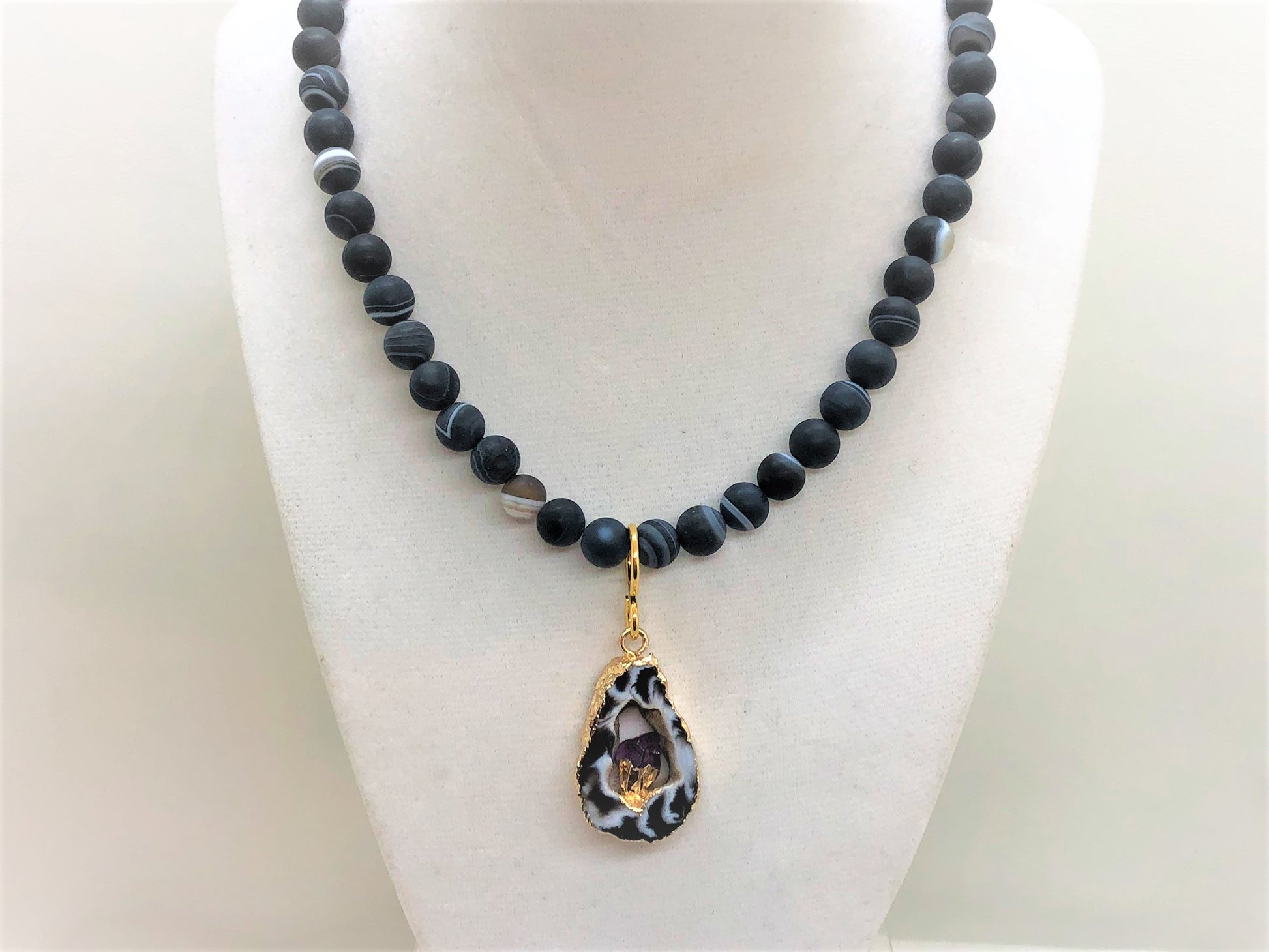 This necklace is also known as Shelby's Creation. Shelby came to me and was looking for a short, beaded necklace to showcase the agate slice with amethyst crystal. Together we came up with this stunner! We sent 3 to California and now it's your chance to rock this rock.