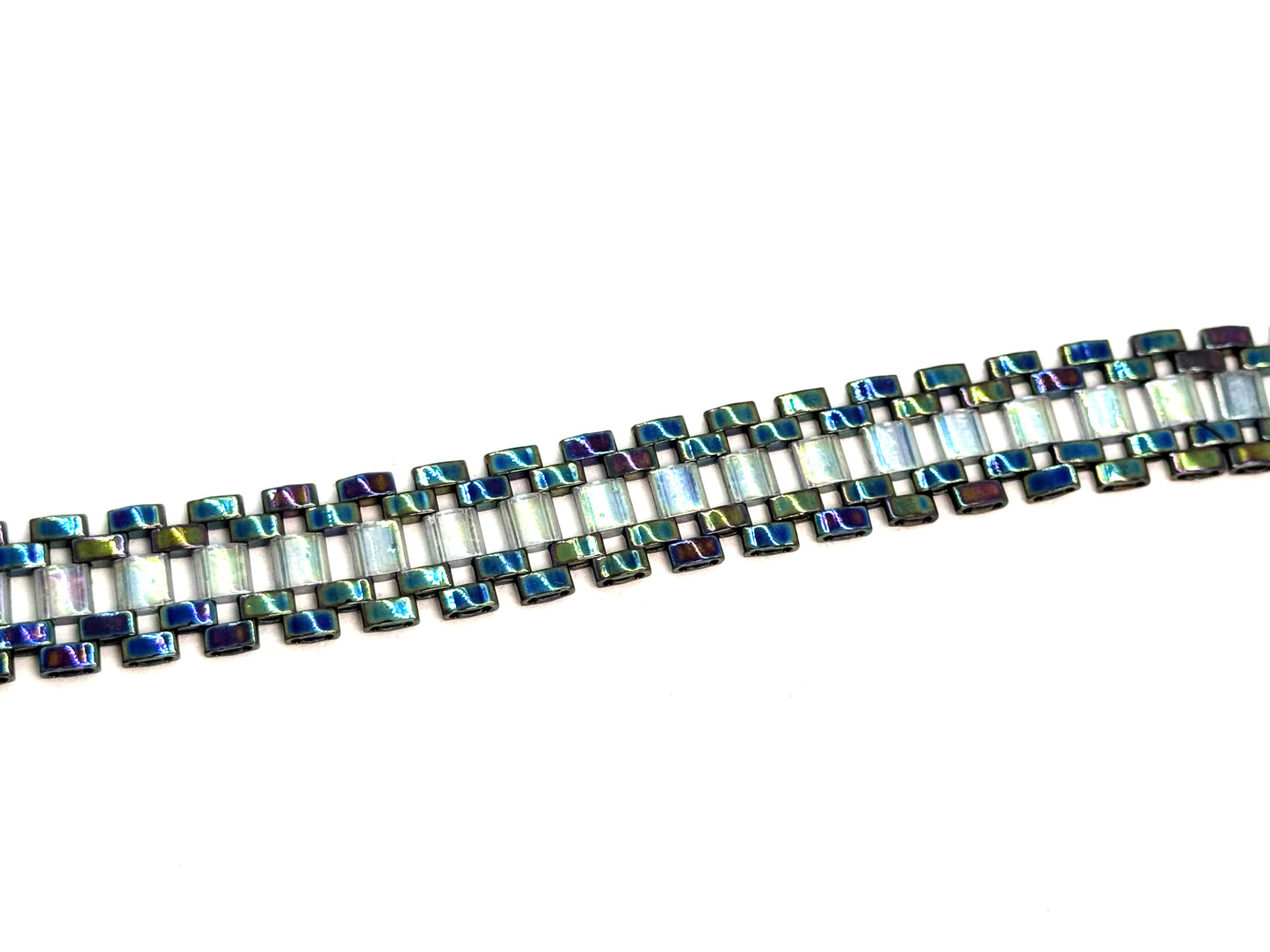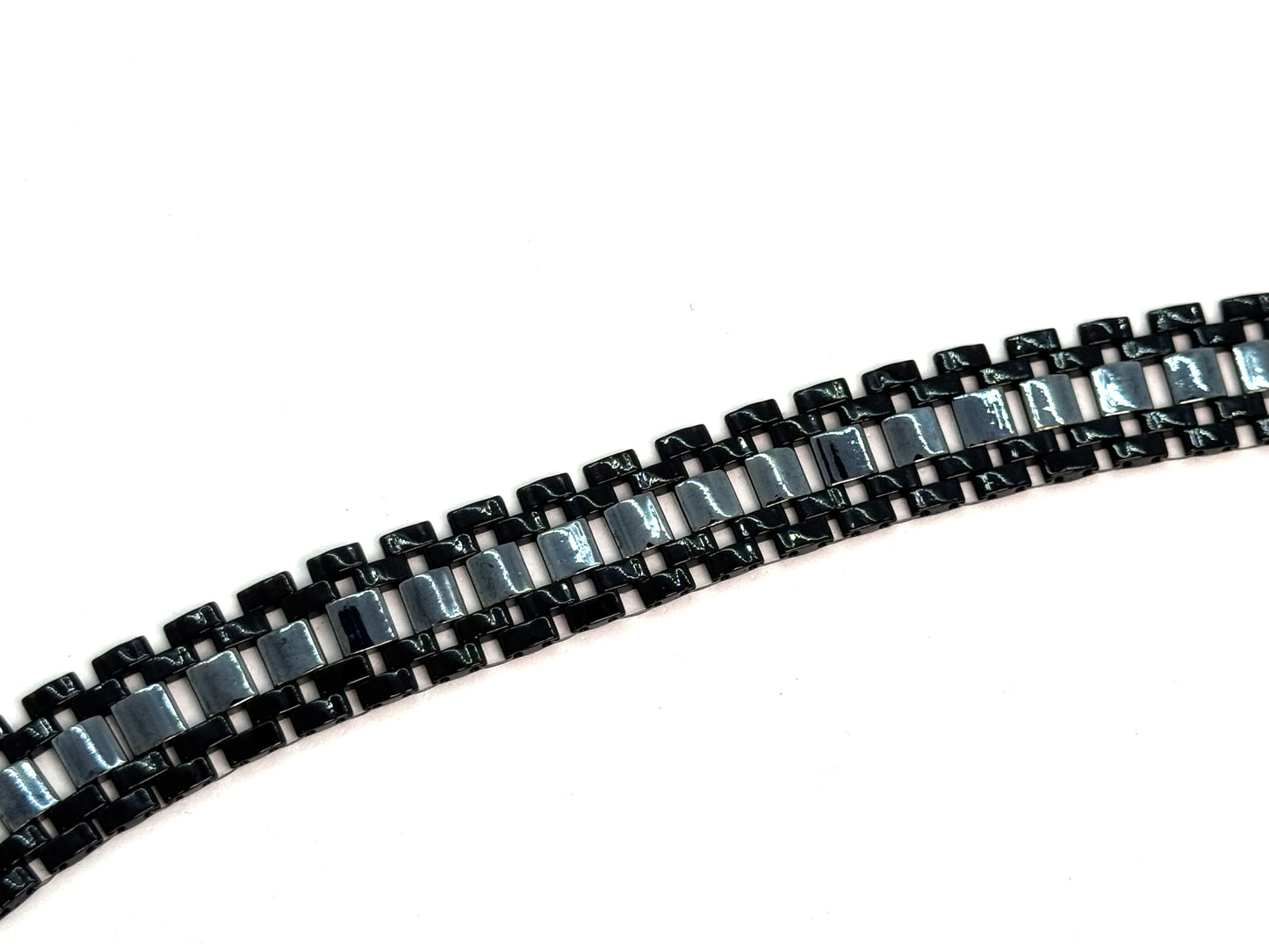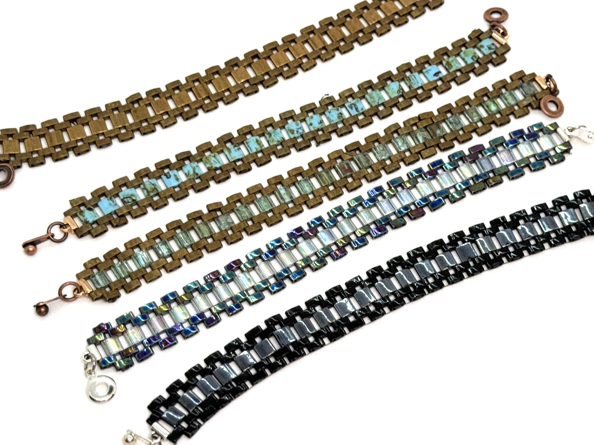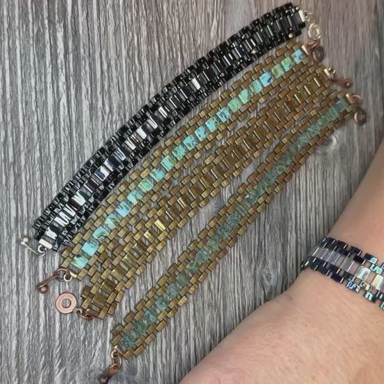 Hop on the trend with our Railroad Handsewn Bracelet! Glass beads in various hues mimic the look of train tracks, making this a must-have accessory for any fashion-forward individual. The convenient snap clasp adds practicality to this stylish piece. Available in 5 colors, with more on the way!
